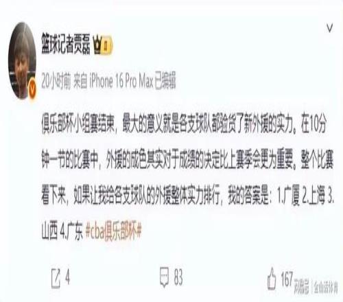 經(jīng)過休賽期的厲兵秣馬,各隊(duì)的引援工作,如今基本上進(jìn)入尾聲。通過俱樂部杯賽的檢驗(yàn),各隊(duì)所引進(jìn)的外援“是騾子是馬”,也基本看出了端倪。日前,國(guó)內(nèi)著名體育記者賈磊排出了新賽季的外援實(shí)力榜,這位資深媒體人,通過俱樂部杯賽各隊(duì)的外援表現(xiàn),分析得出結(jié)論,認(rèn)為外援實(shí)力最強(qiáng)的四支球隊(duì),分別是廣廈男籃、上海男籃、山西男籃和廣東男籃。