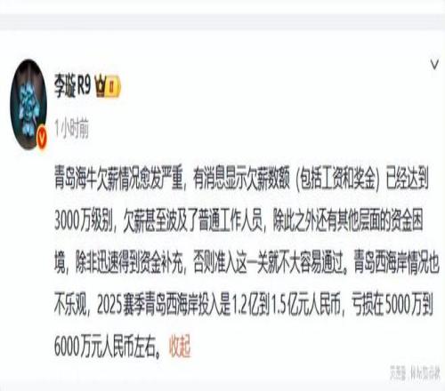 問題在于,奇跡并不能年年復(fù)制。2025賽季開始前,期待中的股改和新資金始終沒能落地,球隊(duì)再次深陷保級泥潭。雖然還是留在了中超,但同時也留下了更沉重的賬單。欠薪已經(jīng)不是零星問題,據(jù)一位足球媒體人透露,海牛欠薪的數(shù)額已經(jīng)達(dá)到了3000萬,連工作人員都被波及,準(zhǔn)入成了擺在眼前的一道坎。即便地方的扶持資金到賬,但區(qū)級的配套資金卻遲遲不見影子,時間一拖,壓力越來越大。