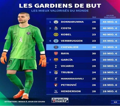 北京時(shí)間12月15日,在更新了法甲球員的身價(jià)之后,德轉(zhuǎn)列出了目前世界足壇身價(jià)排名前10的門將,多納魯馬4500萬歐元第一,此次更新后身價(jià)下跌500萬歐元的舍瓦利耶以3500萬歐元并列第四。