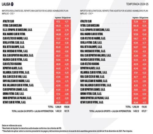 西甲俱樂部的具體調(diào)整后電視轉(zhuǎn)播權(quán)收入如下: